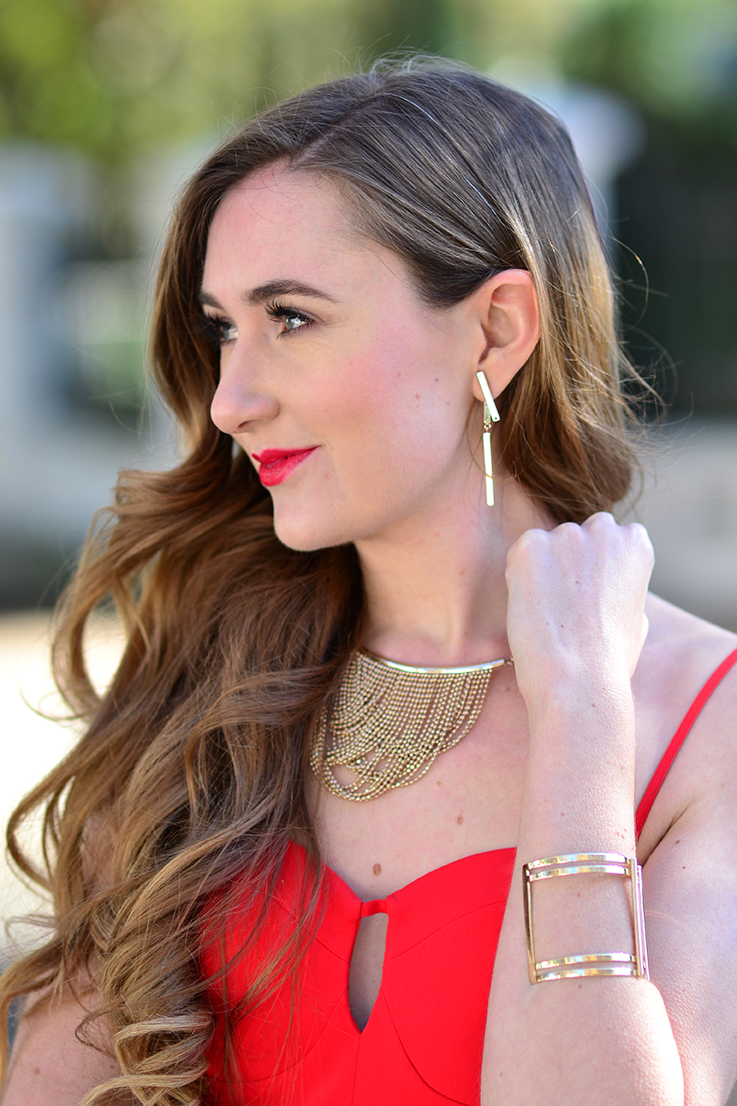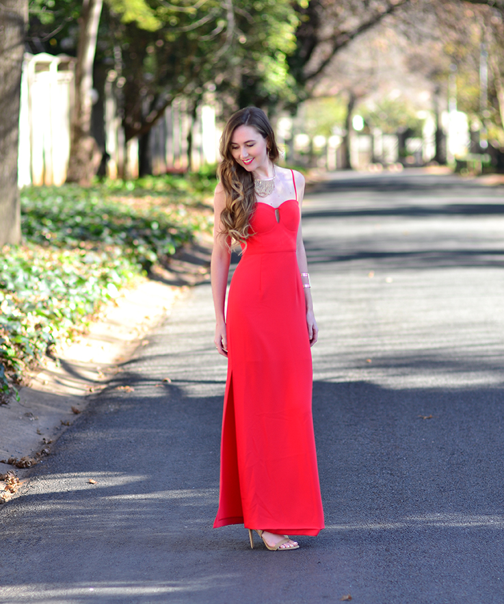 In today’s post I’ve chosen this gorgeous red, floor length dress (similar here and here). It is very simply cut and fabric allowing your figure to do all the talking. This bold red shade is so striking that you can see it coming a mile away. For some odd reason I actually don’t wear much red and after seeing this dress I’m seriously questioning why not. I definitely need to incorporate more of this firey colour into my wardrobe. To accessorise this gorgeous dress I decided to stick with gold detailing in the form of this chain link necklace, cuff and earrings. I couldn’t help myself when it came to lipstick – how could you not wear a bold red lip with this dress (I’m wearing this lipstick? My ideal choice in shoes would be these, these or these.