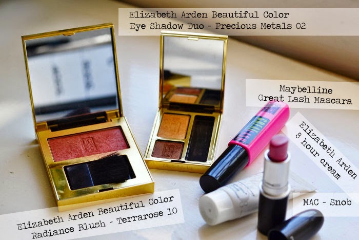 To start with I’ll apply my foundation and blend it with my fingers rather than a sponge or foundation brush to save time. I’ll dab on a little Elizabeth Arden 8 Hour Cream to moisturise my lips. Next I use this amazing Elizabeth Arden eye shadow duo and apply the light gold shade in the inner corner of my eyelid and the brown shade on the outer corner. These are such beautiful neutral shades and couldn’t be more perfect for moments when time is of the essence. I’ll line my top lid with liquid liner then apply my favourite mascara, the Maybelline Great Lash mascara to open up my sleepy eyes. I use Elizabeth Arden’s Beautiful Color Radiance Blush on my cheeks to add some colour. Finally I use MAC Snob for a lovely soft pink lip.
