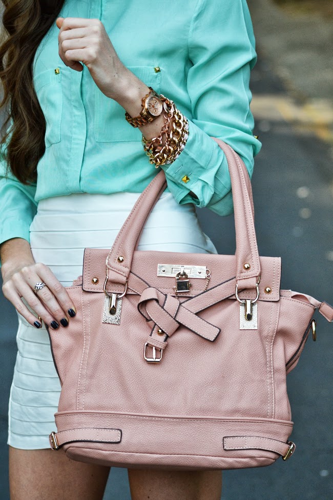 I love the gold detailing on the blouse! The mint and pink look wonderful together too (: