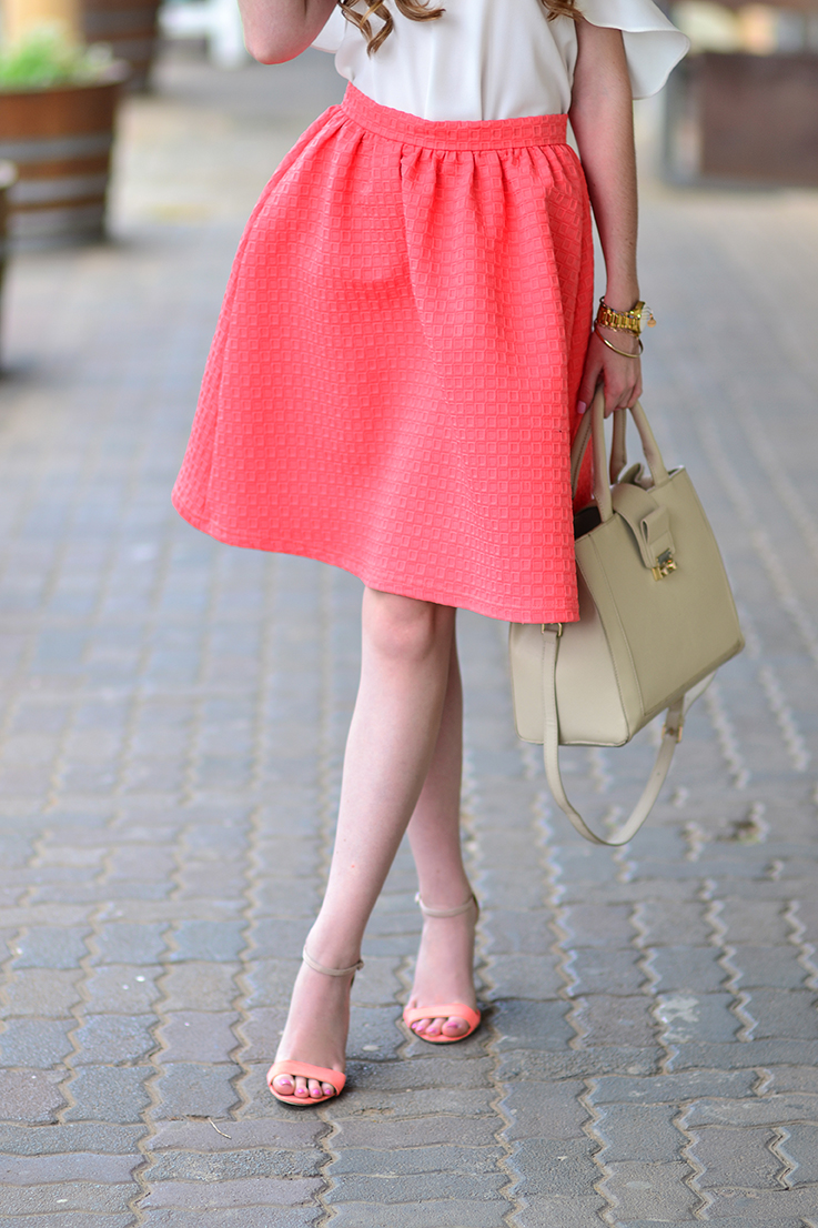 This past weekend I wore this cold shoulder blouse (last seen here and here) and paired it with this bright midi skirt for a fun, feminine outfit. I’m really obsessed with this cold shoulder top. I’ve been wearing it non-stop lately. I think they are so beautiful and they pair so well with pretty much anything. As you know I’m also a complete sucker for any midi skirt so, naturally, I added this bright orange one to my collection.